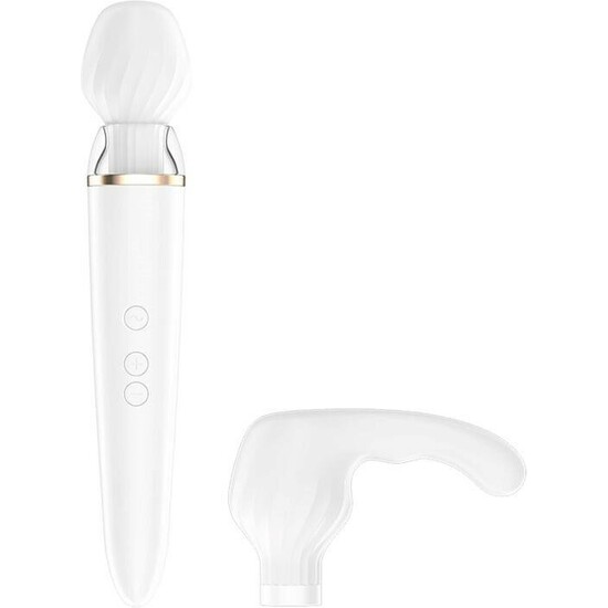 Disfrute de una tranquilidad profunda con el masajeador clítoris Double Wand-er con app de la marca Satisfyer. el lindo masajeador blanco viene con 2 complementos y es espectacularmente versátil.